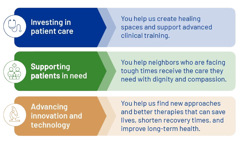 As a not-for-profit hospital, your generosity funds our greatest needs, providing the latest tools, training, and treatments.